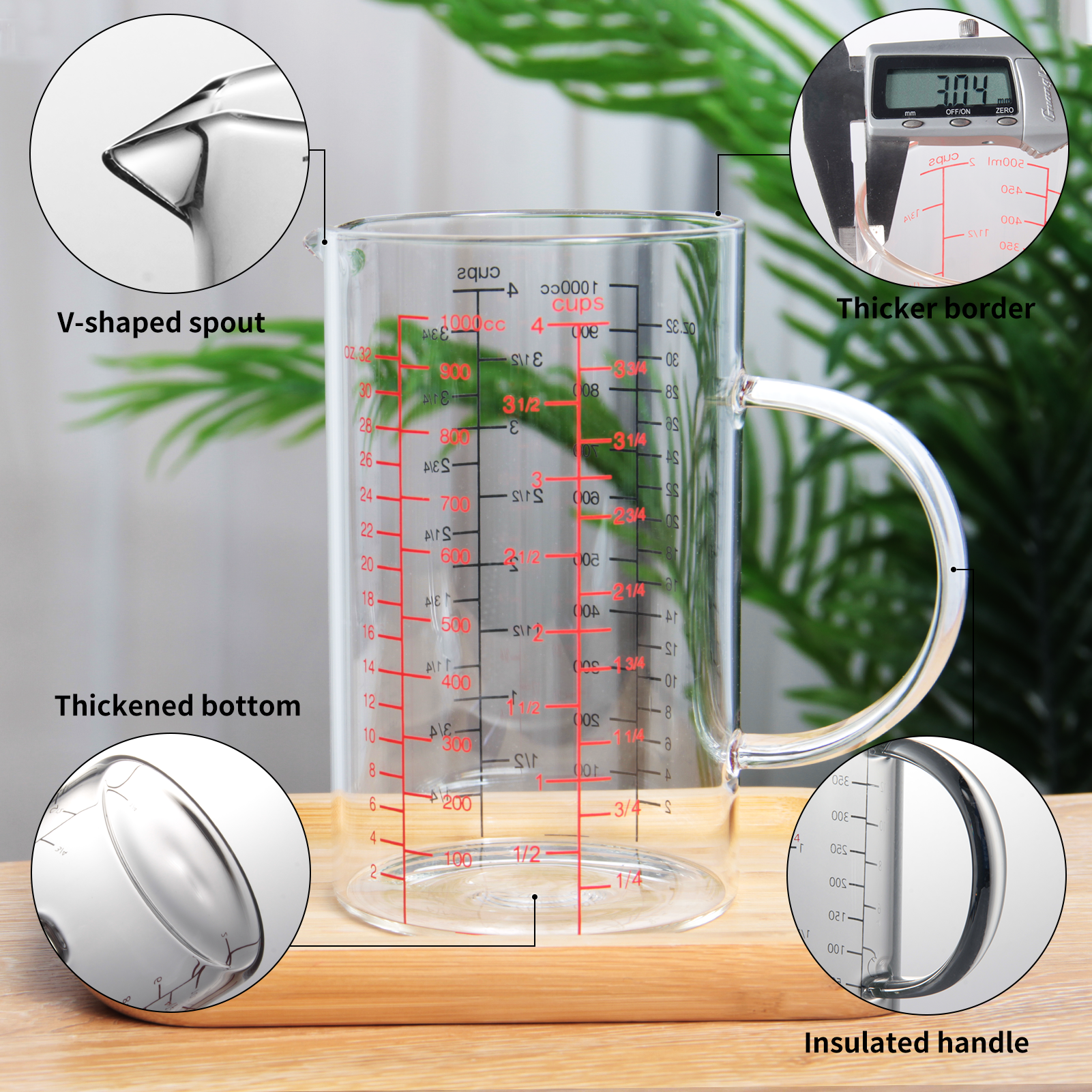 Wide mouth design: The measuring cup is easy to clean. V-shaped spout, liquids can be pouring straight for easy to drainage. Convenient insulated handle