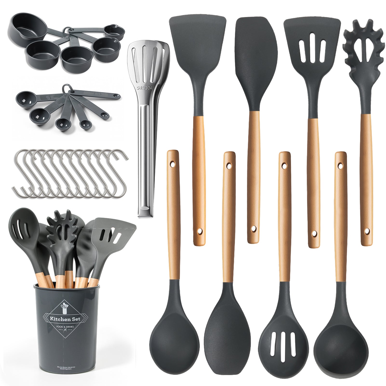 MEET YOUR ALL KINDS OF KITCHEN NEEDS: 32 professional silicon Kitchen utensil set includeshe set includes 1 pcs solid turner, 1 pcs large spatula, 1 pcs spoon spatula, 1 pcs deep soup ladle, 1 pcs solid spoon, 1 pcs slotted turner, 1 pcs spaghetti spoon, 1 pcs slotted spoon, 1 pcs food tong, 5 pcs measuring cups, 6 pcs measuring spoons, 1 pcs kitchen utensils set holder, 11 pcs hooks.